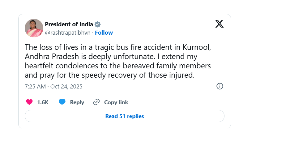 “कुरनूल में बस में आग लगने की घटना अत्यंत दुखद है। जिन परिवारों ने अपने प्रियजनों को खोया है, उनके प्रति मेरी गहरी संवेदना है।”